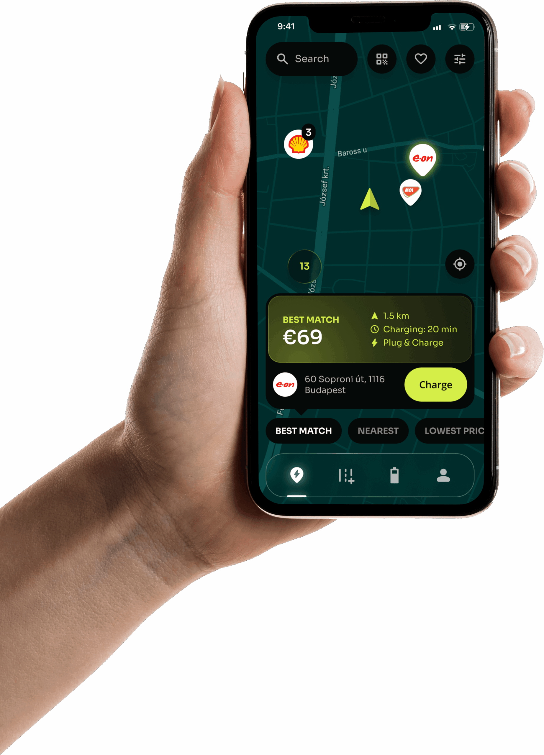 Zökkenőmentes töltési élmény automatikus foglalással, fizetéssel és monitorozással. Járművedre szabva.